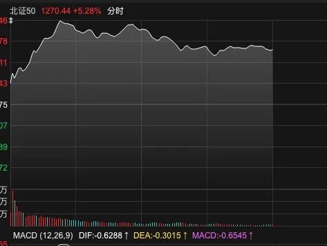 北证50指数高开后持续攀升,盘中一度大涨逾8%,率先收复本周一全部失地,周二以来累计反弹约24%。截至午间收盘,该指数涨幅为5.28%。